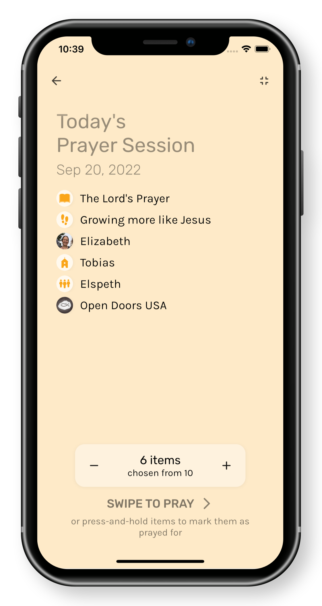PrayerMate keeps track of what you're praying for, so you never forget to pray for the people and causes you care about. Our daily reminders help keep you on track.